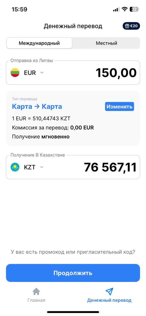 Денежные переводы в Казахстан из Европы в казахские тенге на данный момент бесплатные — мы не взимаем комиссию. Доступны переводы на банковские карты. Получателю зачисляется именно та сумма, которую вы видите в приложении при создании перевода. Без скрытых комиссий и неприятных сюрпризов.