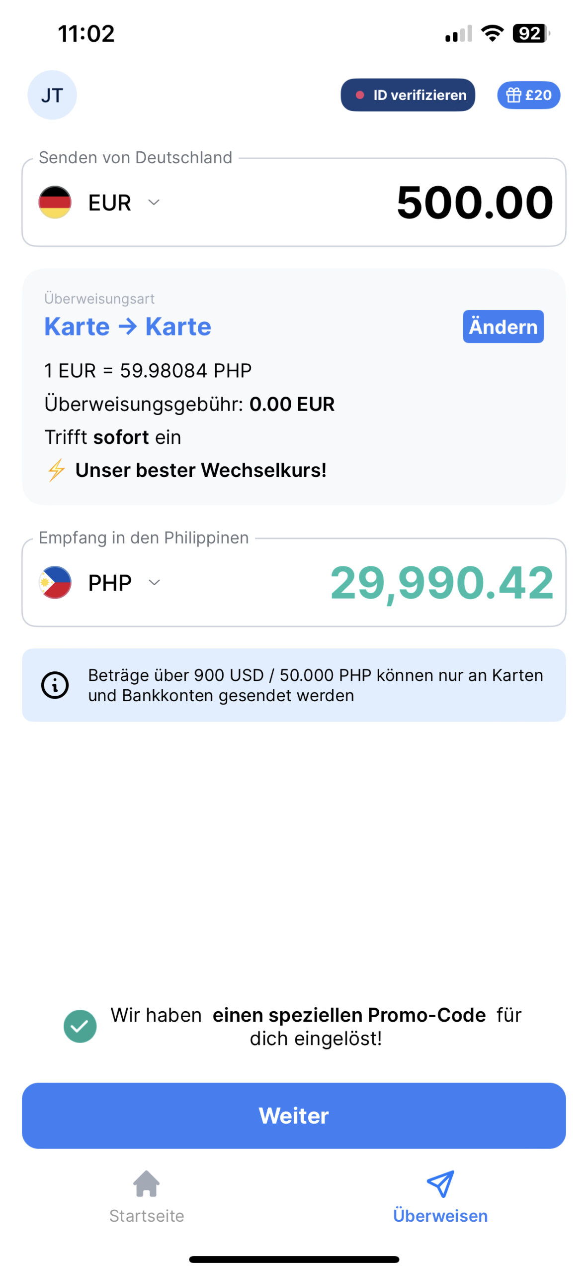 Mit TransferGo gibt es keine strikte Obergrenze für Überweisungen auf die Philippinen. Wenn du per Banküberweisung zahlst, kannst du also beliebig große Beträge senden. Meistens haben aber Banken eigene Limits, die du natürlich beachten musst. Bei Kartenzahlungen liegt das Limit bei 10.000 GBP pro Transaktion (oder dem entsprechenden Betrag in Euro). Du kannst jedoch mehrere Transaktionen hintereinander durchführen, falls du größere Summen senden möchtest. Beachte, dass du Auslandsüberweisungen, die über 12.500 € liegen, an die Bundesbank melden musst.