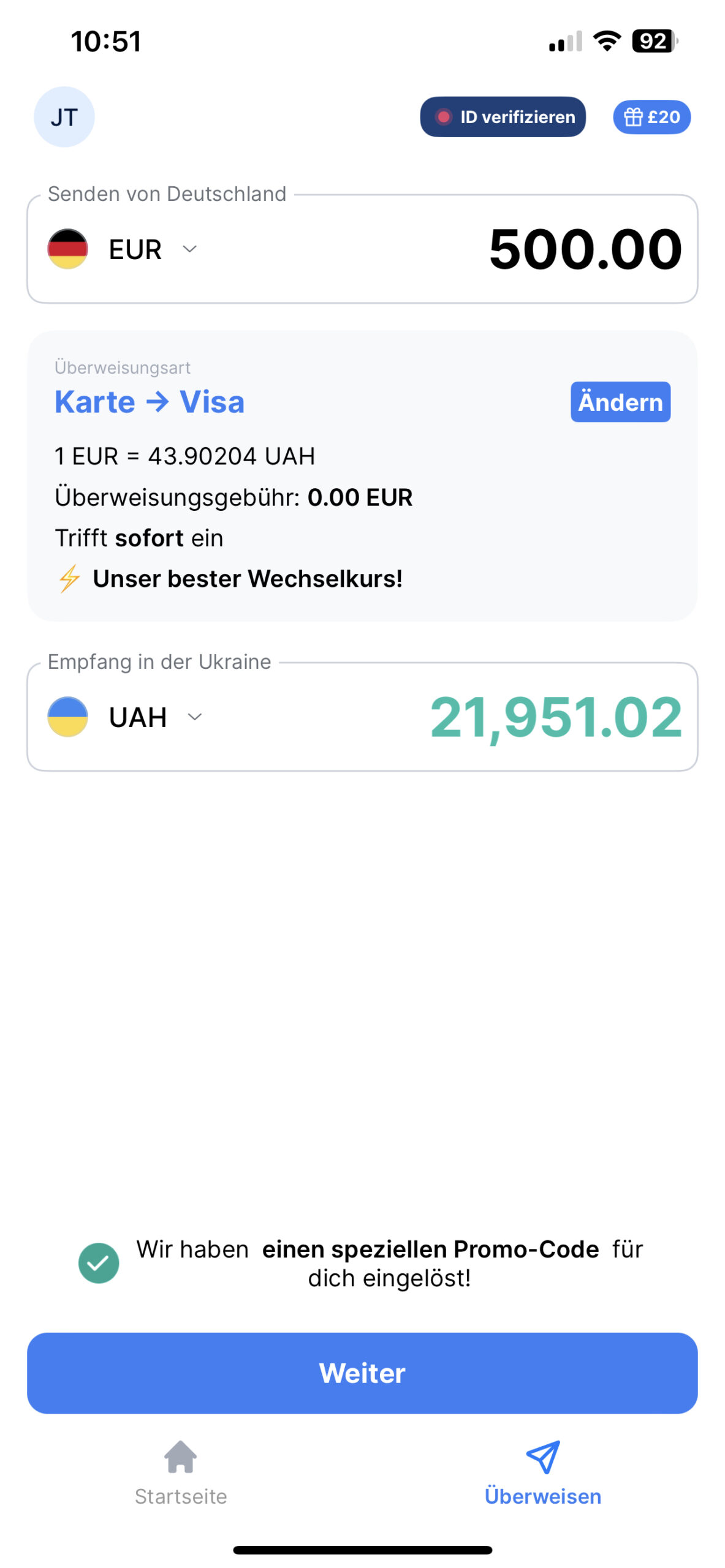 Alle unsere Transfers in die Ukraine mit Ankunft am nächsten Werktag sind kostenfrei! Egal ob du Geld an eine Karte oder Bankkonto sendest… Es fallen keine Gebühren an. Wir verstecken keine Kosten. Der Empfänger bekommt genauso viel, wie in unserer App angezeigt. Es gibt keine versteckten Gebühren und keine bösen Überraschungen.