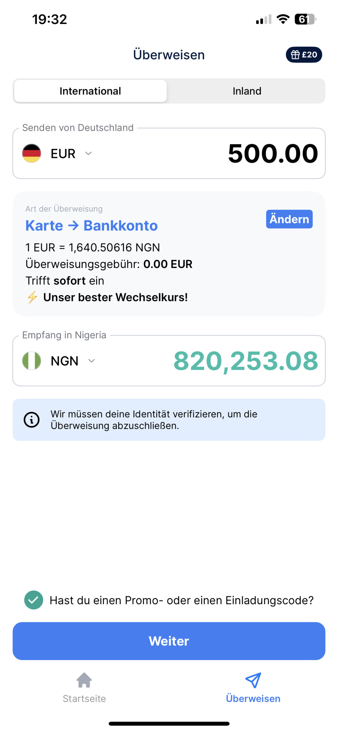 Mit TransferGo wird Geld günstig überwiesen, da du keine Überweisungsgebühren bezahlst. Deswegen nutzen viele nigerianische Staatsangehörige in Europa die TransferGo-App, um Geld online in ihre Heimat zu überweisen. Zusätzlich bekommen die Neukunden die niedrigsten Wechselkurse für die erste Überweisung.