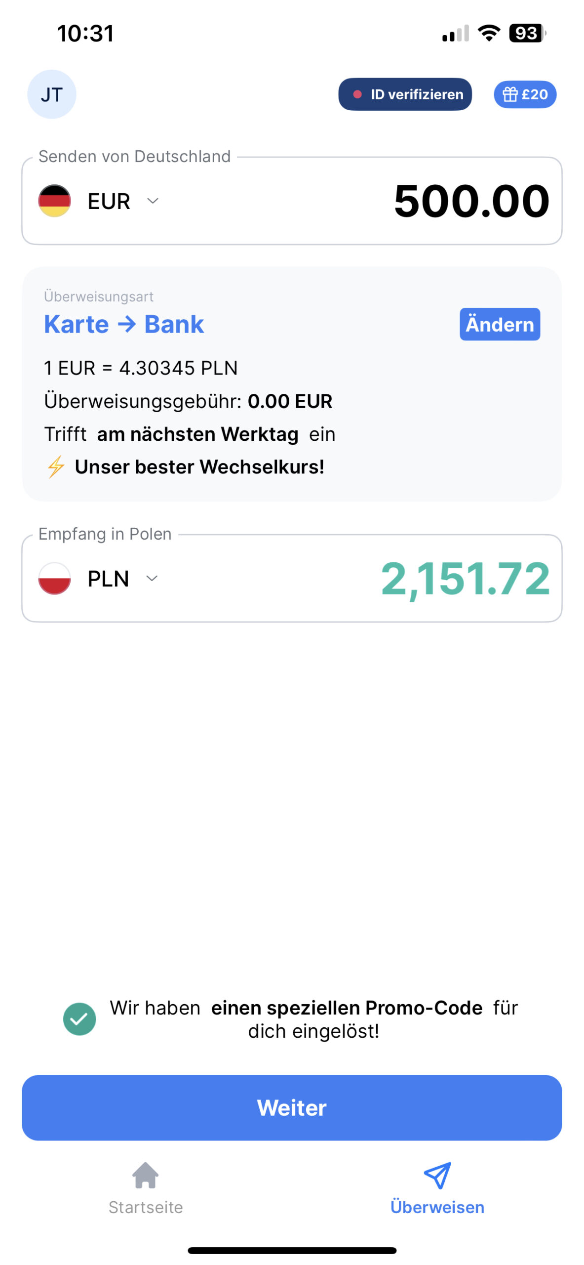 Der Vorgang ist unkompliziert: Du gibst Polen als das Land des Absenders, den Betrag und die Währung des Empfängerkontos (in diesem Fall „Euro“) an. Und schon kann’s losgehen.