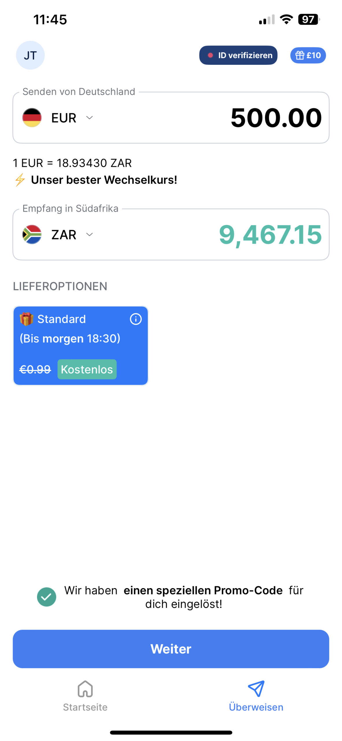 Alle unsere Transfers nach Südafrika mit Ankunft am nächsten Werktag sind kostenfrei! Egal ob du Geld an eine Karte oder Bankkonto sendest… Es fallen keine Gebühren an. Wir verstecken keine Kosten. Der Empfänger bekommt genauso viel, wie in unserer App angezeigt. Es gibt keine versteckten Gebühren und keine böse Überraschung.