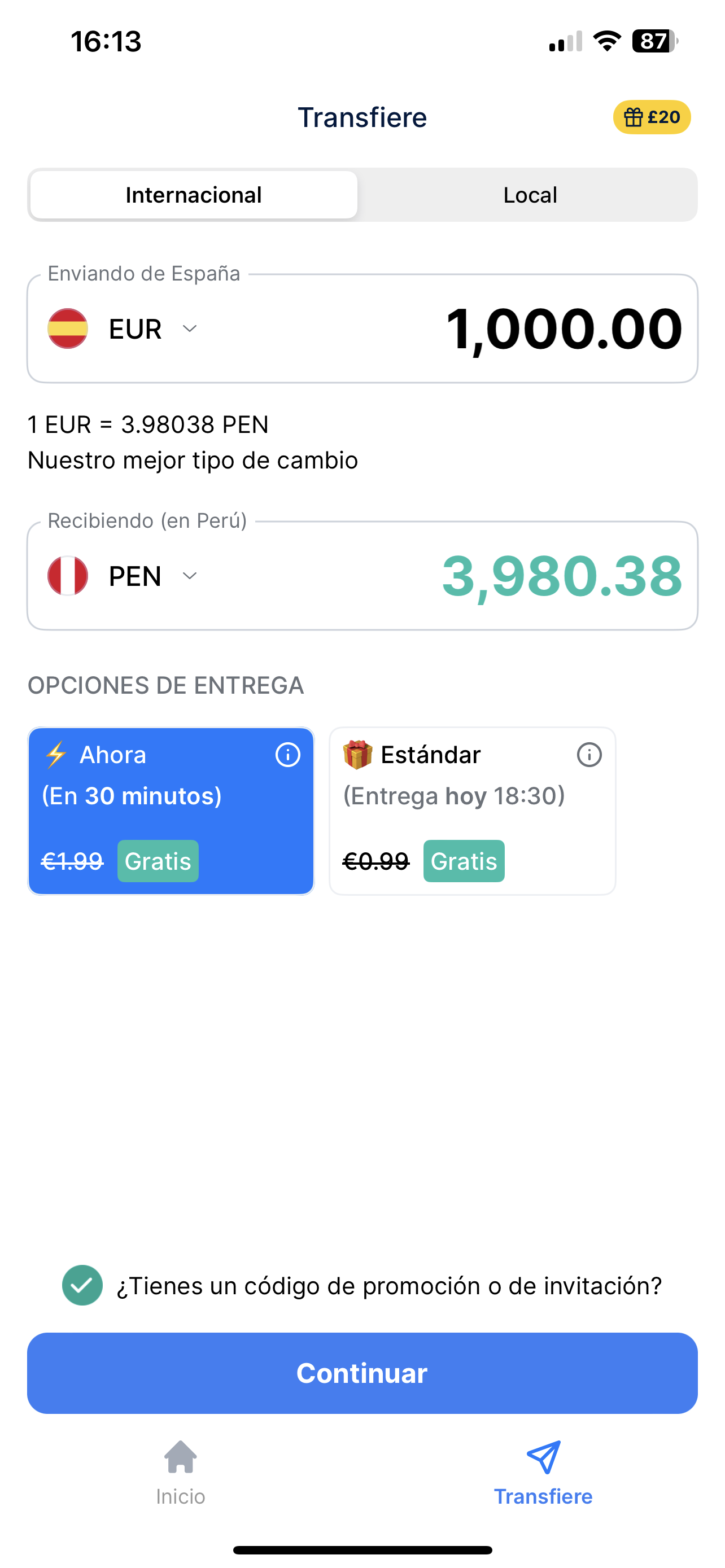 Los tiempos de entrega dependen de qué método de entrega elijas. Si eliges ‘Ahora’, el dinero llegará en menos de 30 minutos, generalmente el tiempo de transferencia es de 2 o 3 minutos como máximo. Si eliges ‘Estándar’, el dinero llegará al siguiente día hábil. Las transferencias de dinero a Perú son gratuitas utilizando tanto el método de entrega ‘Ahora’ como ‘Estándar’.