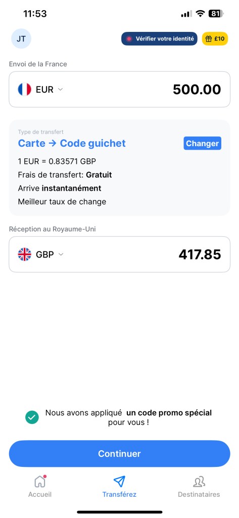 Le meilleur moyen d’envoyer de l’argent au Royaume-Uni et dans de nombreux autres pays du monde est d’utiliser les services de transfert d’argent par application mobile. TransferGo est une application gratuite qui vous permet d’effectuer des transferts d’argent en ligne à un taux avantageux et sans frais, et qui se distingue par son excellent service clientèle en anglais et en français. Il n’existe pas de retrait d’espèces!