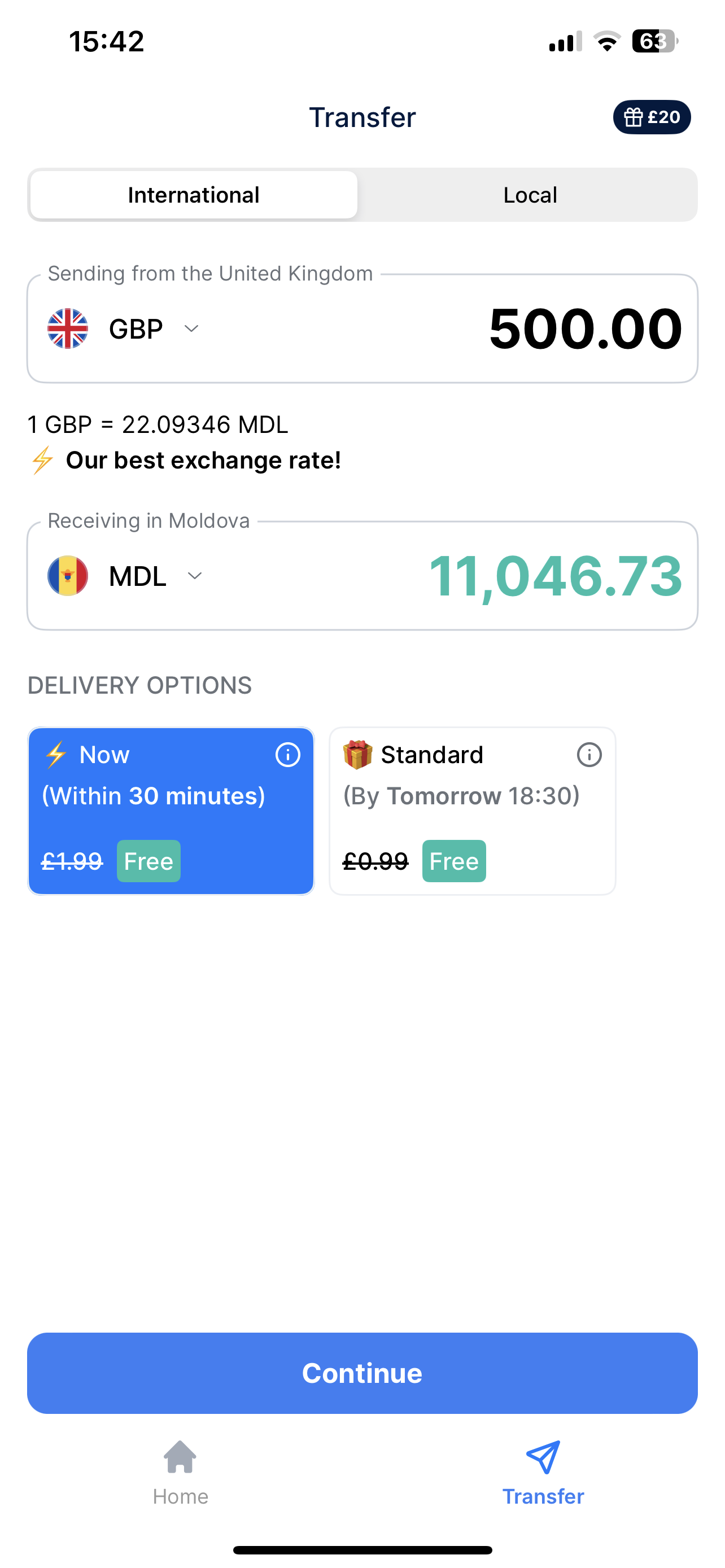 Your first two transfers to Moldova are free using both our Now and Standard delivery options. After that, we keep the fees low.