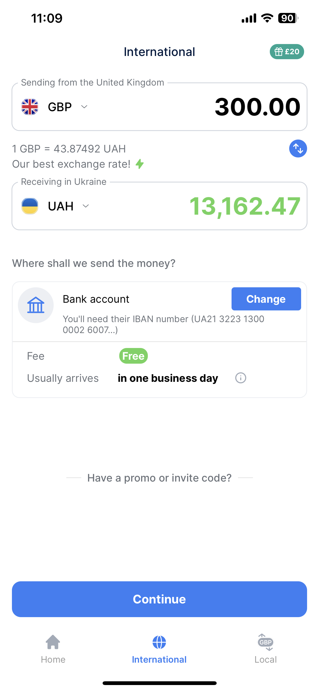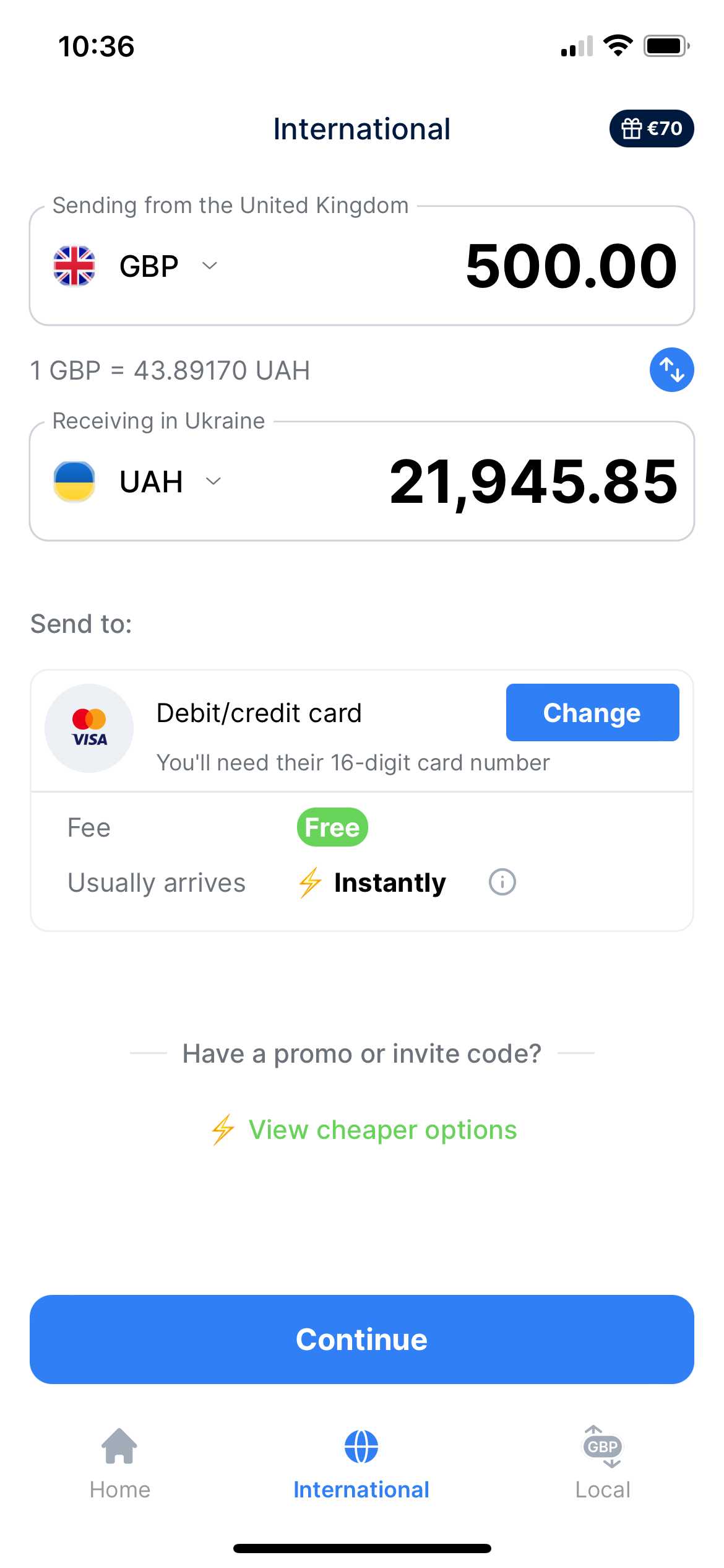Our fastest option is instant, which usually arrives in 2-3 minutes. You can also make a transfer the next day, but instant money transfers from Great Britain to Ukraine are free right now—so why wait?