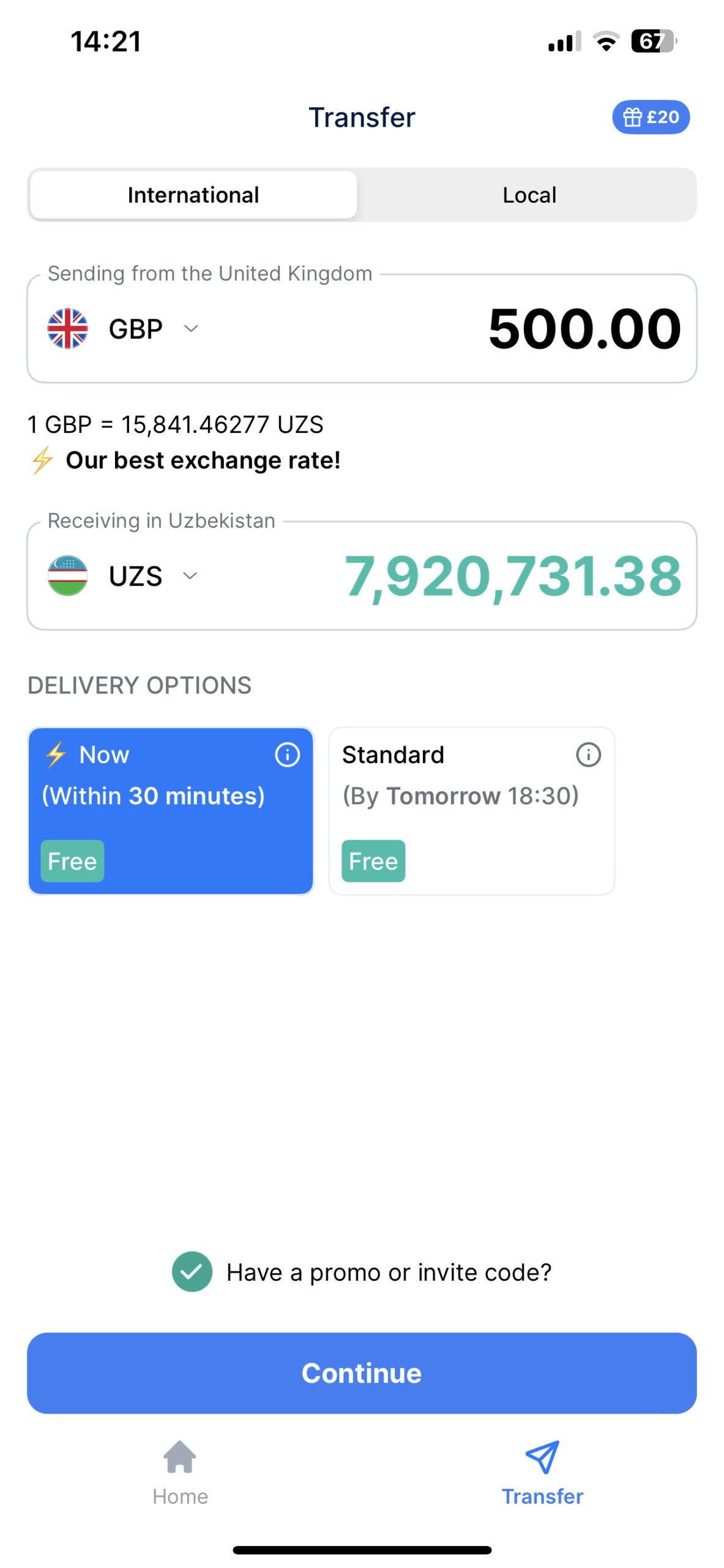 Our fastest option is instant, which usually arrives in 2-3 minutes. You can also make a remittance the next day, but your first 2 instant money transfers to Uzbekistan are free right now—so why wait?