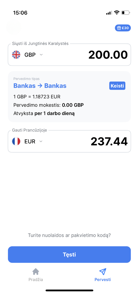 Pirmi 2 pervedimai į Prancūziją yra nemokami! Po to mūsų taikomi mokesčiai išlieka nedideli. Gavėjas gauna tikslią sumą, kurią nurodo mūsų programėlė. Jokių paslėptų pervedimo mokesčių, jokių nemalonių staigmenų.