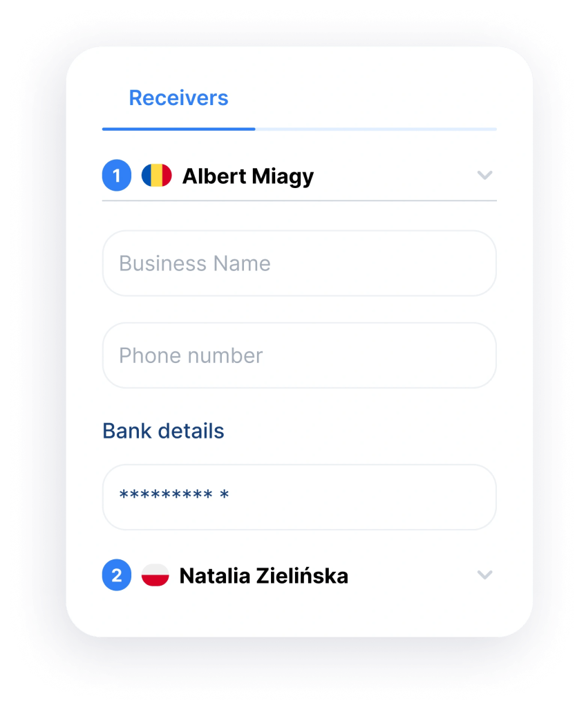 Wprowadź dane każdej osoby lub firmy, do której chcesz wysłać pieniądze. Przygotuj ich imiona, dane bankowe oraz kraje, w których się znajdują. Wystarczy, że zrobisz to raz—dane odbiorców zostaną zapisane, aby przyszłe płatności były jeszcze szybsze i wygodniejsze.