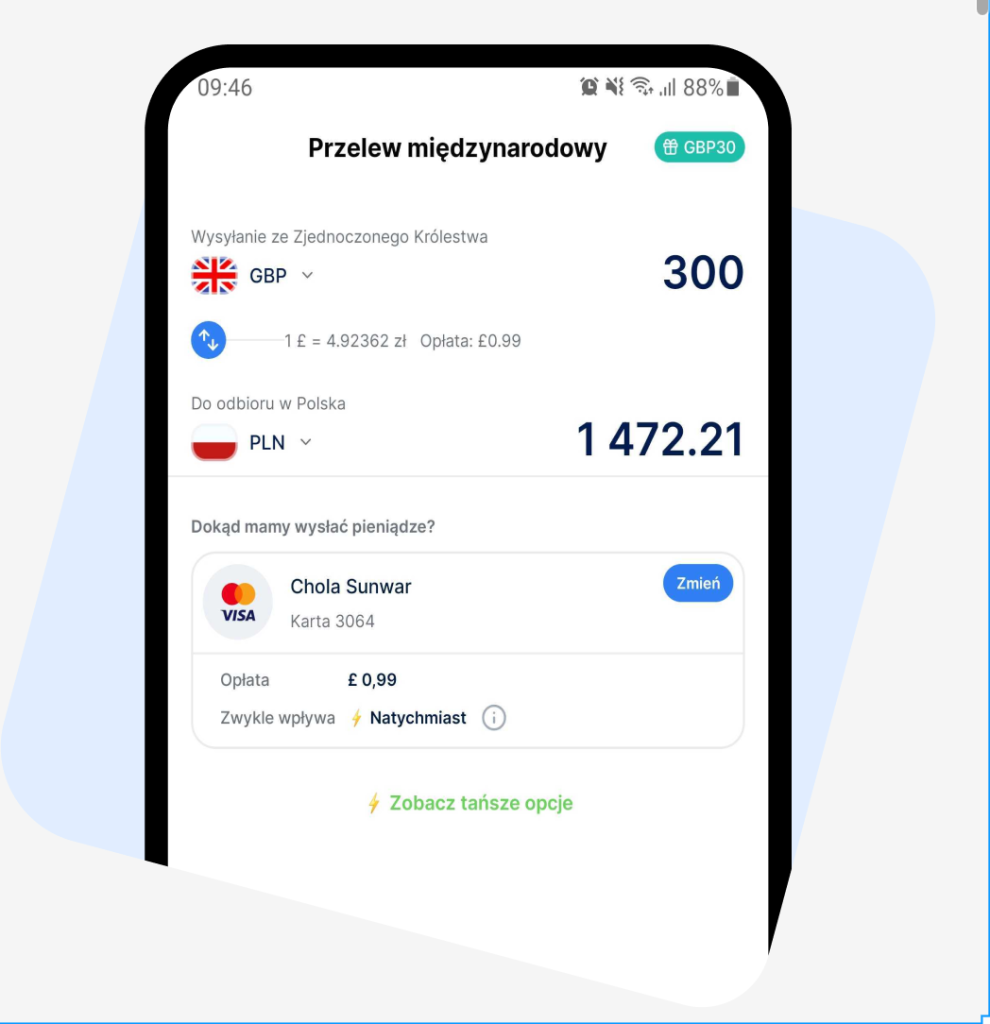 Tak naprawdę na koszt wpływa, przede wszystkim, wybrana metoda przesłania pieniędzy. W przypadku TransferGo, koszt przelewu pieniędzy z karty na kartę jest wyższy w porównaniu do przelewu pomiędzy kontami bankowymi, który jest nieco wolniejszy.