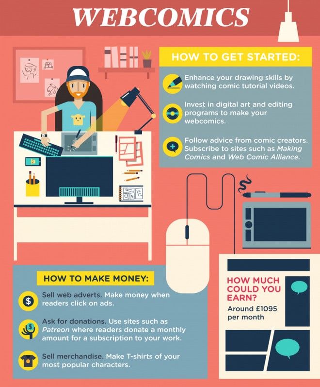 Dacă vă place să desenați, este posibil să găsiți o serie de oportunități să transformați talentul în venituri suplimentare. Veți găsi de multe ori scriitori si agentii de publicitate mici, care au nevoie de ilustratori. Puteți lua în considerare de asemenea, imprimarea de ilustrații pe elemente, cum ar fi tricouri, căni sau cărți de joc. Lumea benzilor desenate este de asemenea, o zonă de creștere pentru ilustratori.