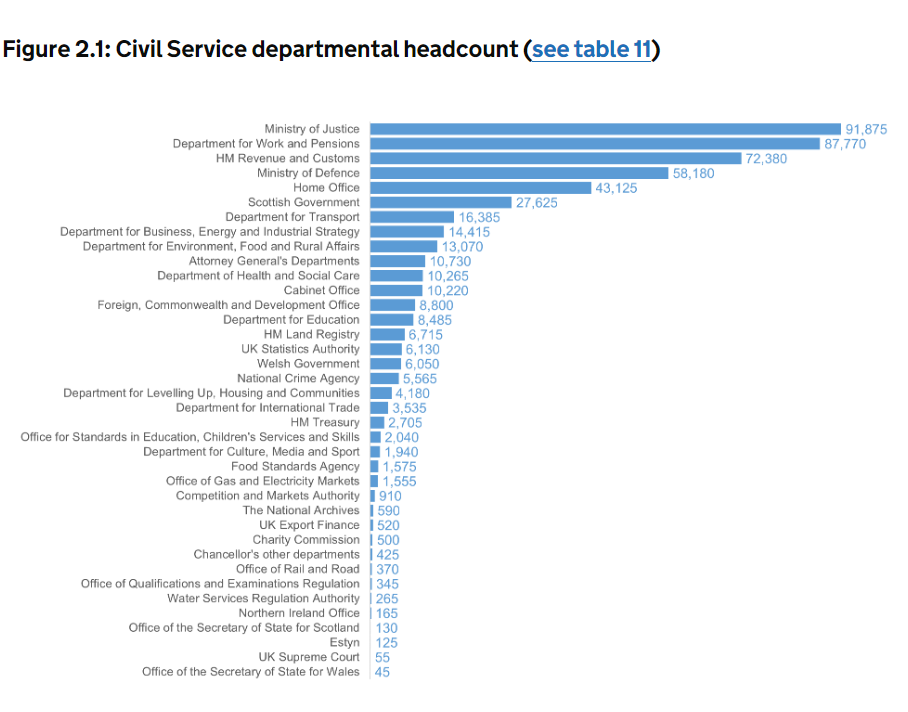 Cel mai mare departament din Serviciul Civil este Ministerul Justiției (foto 1), urmat de Departamentul pentru Muncă și Pensii. Pe locul al treilea se situează Administrația Fiscală și Vamală a Majestății Sale (HM Revenue and Customs), apoi Ministerul Apărării și Ministerul de Interne (Home Office). Personalul din aceste departamente reprezintă aproximativ 68% dintre funcționarii publici.