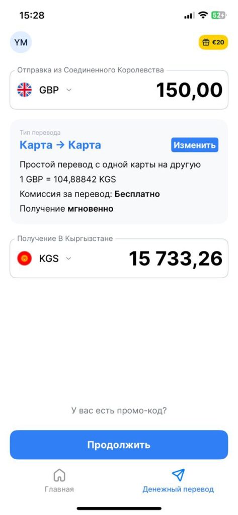 Перевод денег в Кыргызстан можно сделать в считанные минуты на карту Visa кыргызского банка: без комиссий и переплат. Вы можете выбрать самый выгодный и удобный для вас способ отправки и получения. Получателю зачисляется именно та сумма, которую вы видите в приложении при создании перевода. Без скрытых комиссий и неприятных сюрпризов.