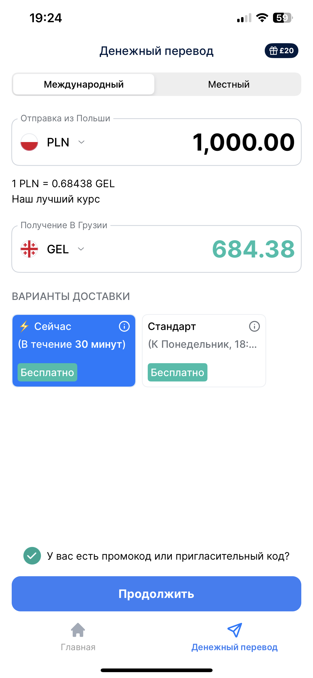 В приложении TransferGo вы можете отправлять мгновенные денежные переводы в Грузию с помощью варианта доставки «Сейчас». Деньги поступят получателю в течение 30 минут — чаще всего это происходит быстрее, за 2-3 минуты максимум. Когда вы выбираете вариант доставки «Стандарт», деньги поступят получателю в течение одного рабочего дня.