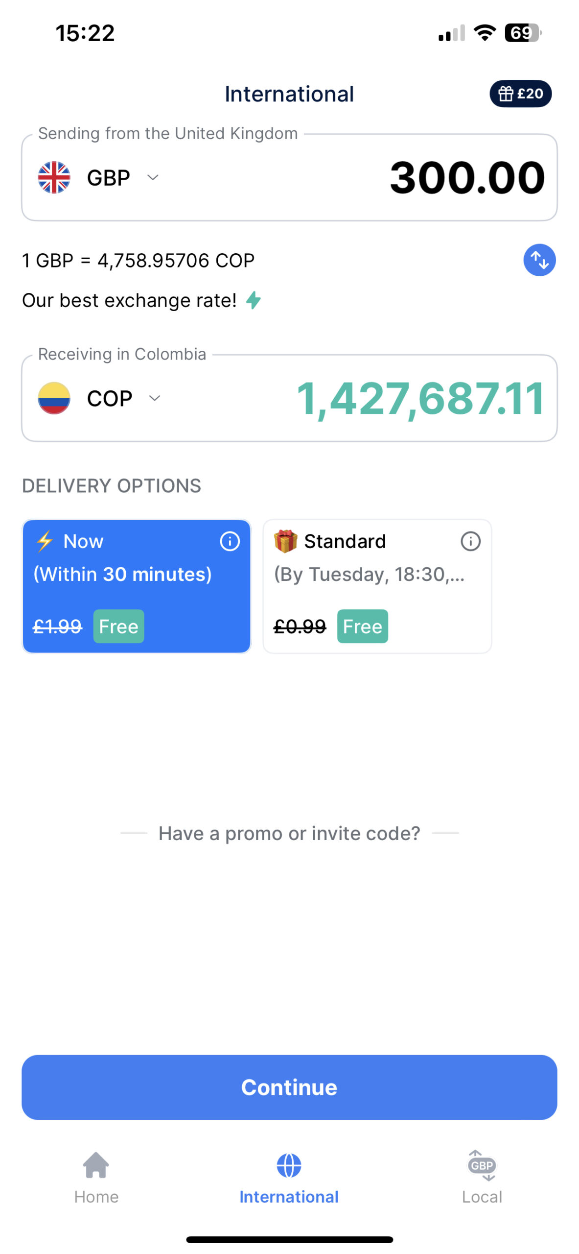 Our fastest delivery times option is instant, which usually arrives in 2-3 minutes. You can also make a transfer the next day, but your first 2 instant money transfers to Colombia are free right now—so why wait?
