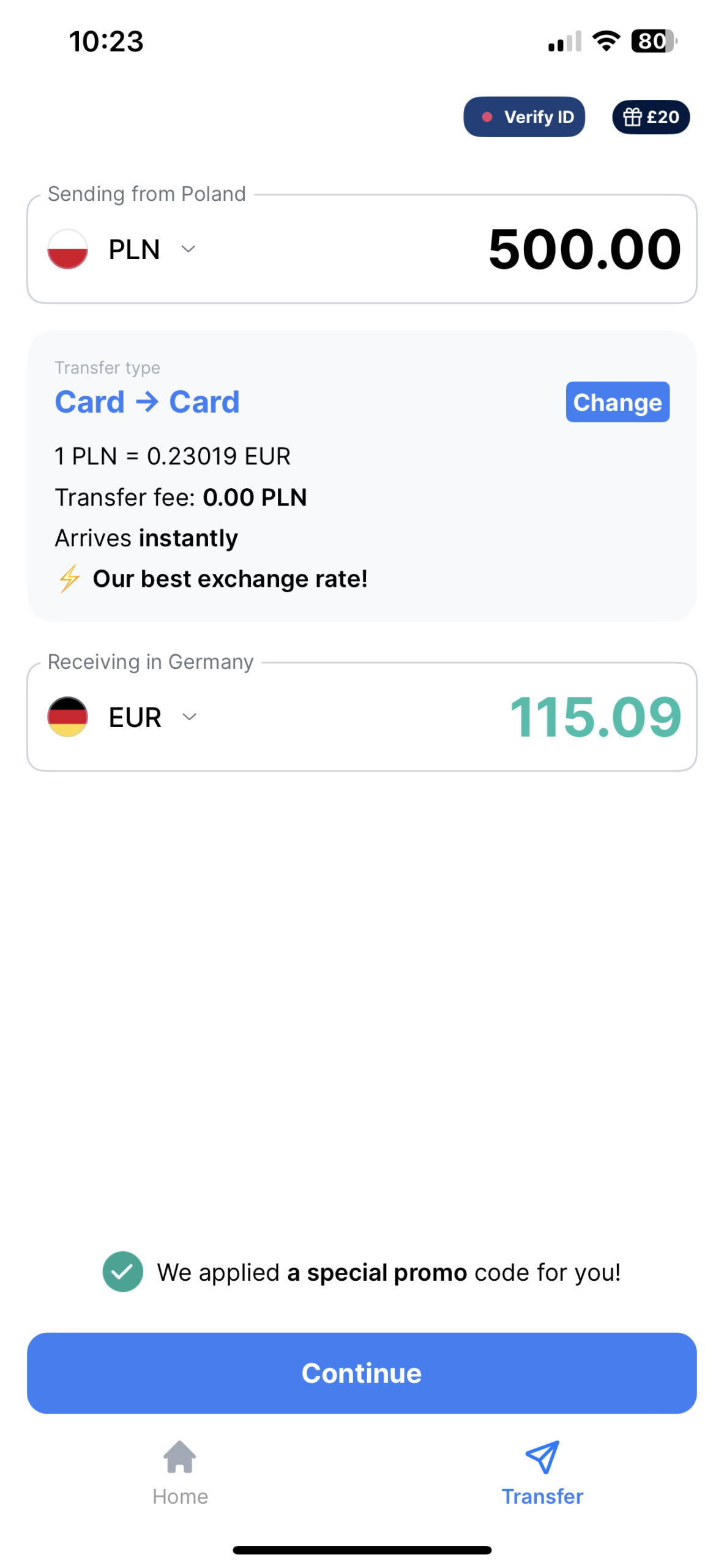 If you want to send money to Germany with a debit card, it’ll make your Germany money transfer super-fast. However, compared to a bank transfer, debit card transfers to Germany can be more expensive as they’re charged at a higher (but still low) fee.