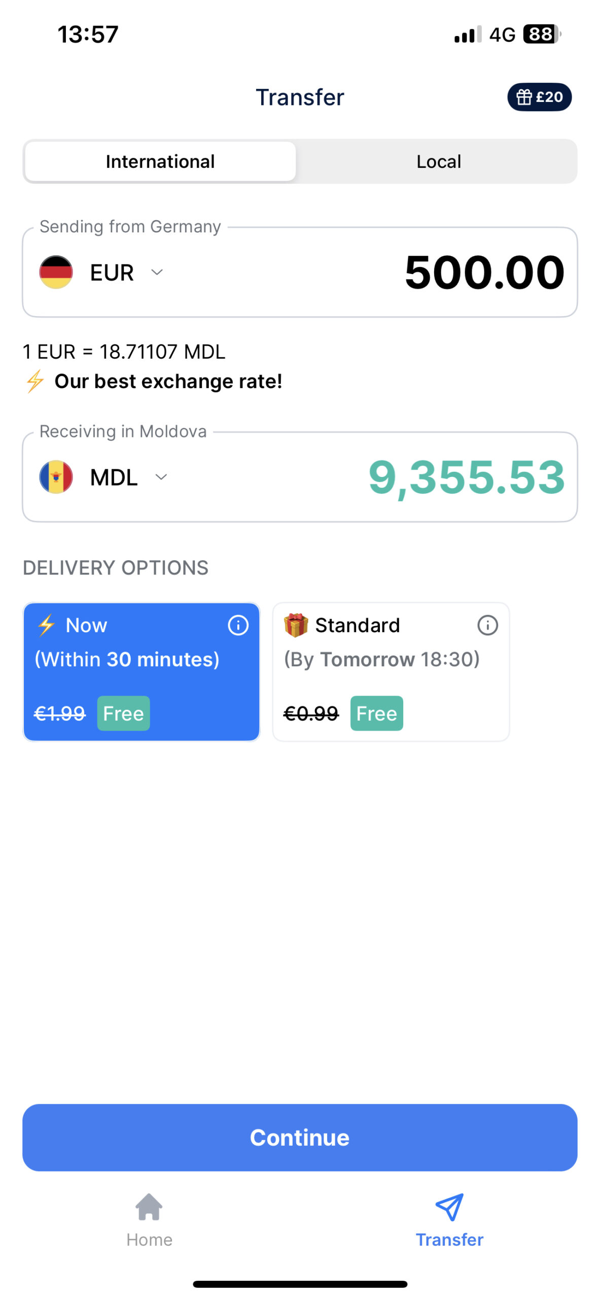 Your first two transfers to Moldova are free using both our Now and Standard delivery options. After that, we keep the fees low.