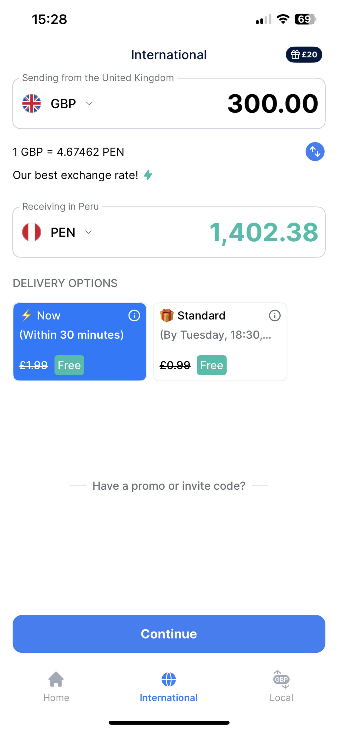 Transfers to Peru with a credit card are free using both our Now and Standard delivery options. We also always try to offer the best currency exchange rates and low fees going forward. No nasty pricing surprises here!