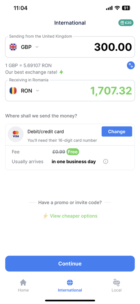 If you’re sending from a credit/debit card, you just use the TransferGo app to make international money transfers to a card or bank account in Romania. Choose the currency you’re sending to, your receiver’s full name and card details (or their phone number), and then your own details. That’s all there is to it.