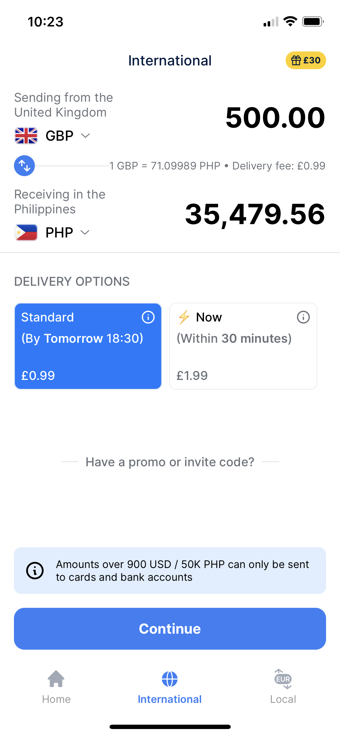 The delivery time depends on which delivery method you choose. If you choose ‘Instant’, the money will arrive in under 30 minutes—usually, the transfer time is 2 or 3 minutes max. If you choose ‘Standard’, the money will arrive within one working day.