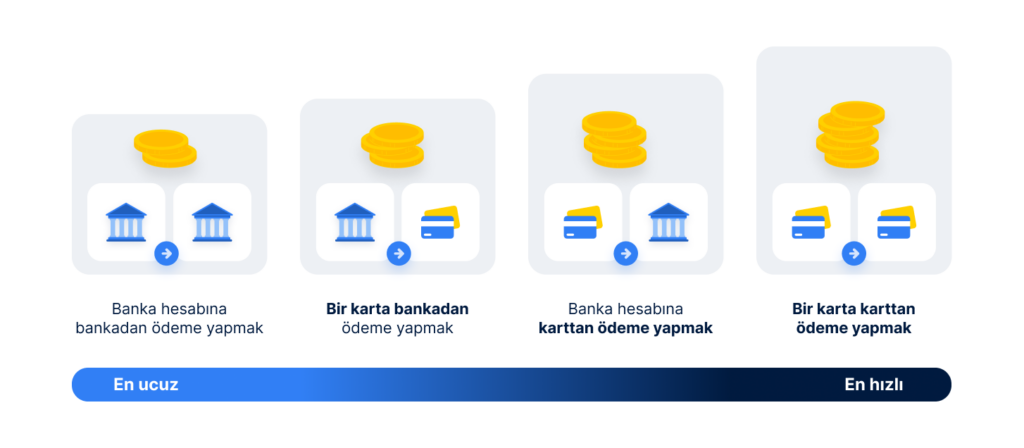 Banka ödemeleri için fazladan birkaç adım daha gereklidir, ancak maliyeti kart ödemelerine göre çok daha düşüktür. Bu, bütçe dostu bir hava yolundan paranızı A noktasından B noktasına götürmesini istemek gibidir. Süreç biraz uzun sürebilir ama sorunsuz ilerler ve düşük maliyetlidir.