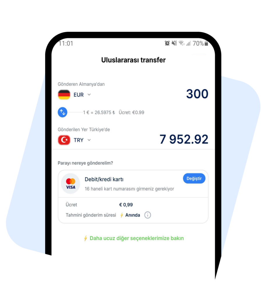 Kart ile ödemeler hızlıdır. Alıcıya daha hızlı ulaşmasının yanı sıra gönderim işlemini uygulama üzerinde yapmakta oldukça kolaydır. TransferGo olarak kullanıcılarımıza yapacakları her gönderim için hızlı bir deneyimin yanı sıra bütçe dostu ve adil bir ücretlendirme sunuyoruz.